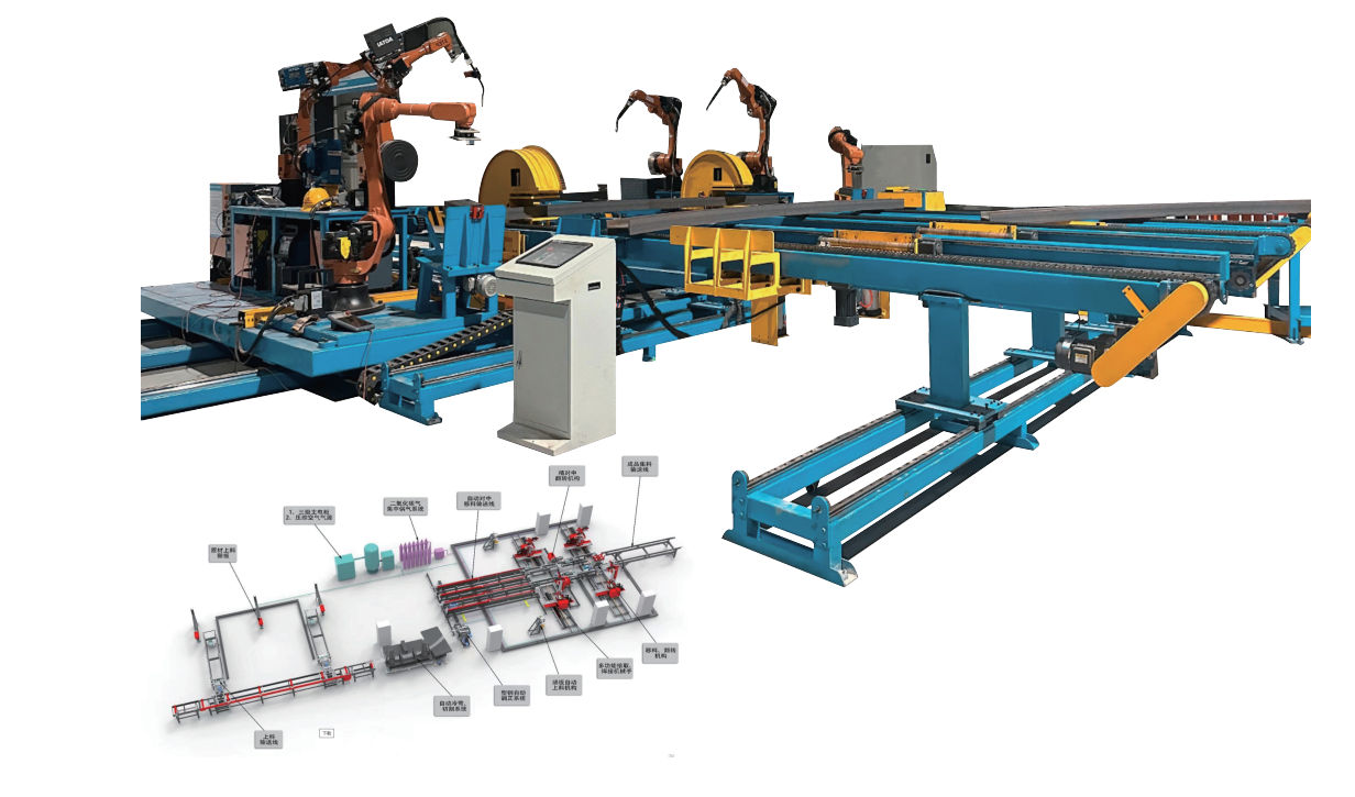 拱架移料部分,自動(dòng)鏈條傳動(dòng)輸送機(jī)架橫向移動(dòng), 平行移動(dòng)至工字鋼反轉(zhuǎn)變位機(jī)、焊接部分,焊接機(jī)器人倒裝于龍門架下,龍門架下設(shè)工字鋼反轉(zhuǎn)變位機(jī),實(shí)現(xiàn)拱架夾緊、旋轉(zhuǎn)功能,兩個(gè)機(jī)器人把聯(lián)接板—側(cè)焊縫施焊后,機(jī)架旋轉(zhuǎn) 180o到工位2,再進(jìn)行另—側(cè)施焊。