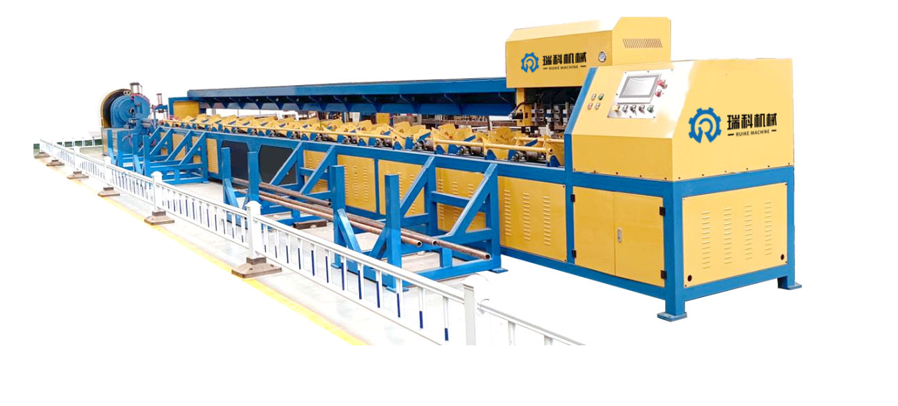 設備集中鋼管打孔和縮尖工序在—體的生產線,操控臺控制整個加工流程,從鋼管原料到后面鋼管表面打孔和前端縮尖加工完成的成品, 生產線可以加工多種長度規格、注漿孔布局規格的鋼管,具有生產效率高、提控自動化程度高的優點。